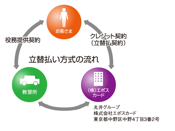 (株)エポスカードがお客さまのお申し込みを承諾(立替払契約が成立)したときは、お客さまの教習費用は(株)エポスカードがお客さまの委託により教習所に立替払いいたします。